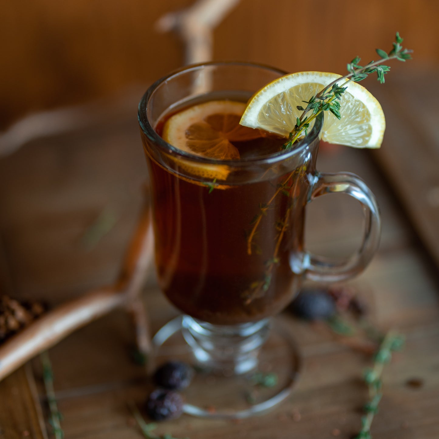 A cozy blend of Tejava Black Tea, lemon, honey, and thyme, lightly spiced with ginger for a soothing, aromatic drink.