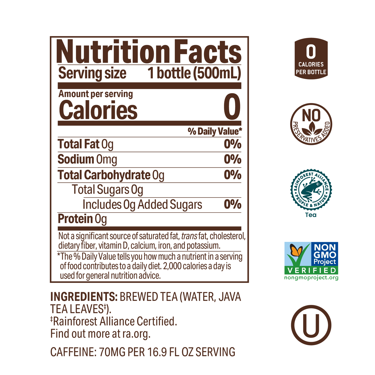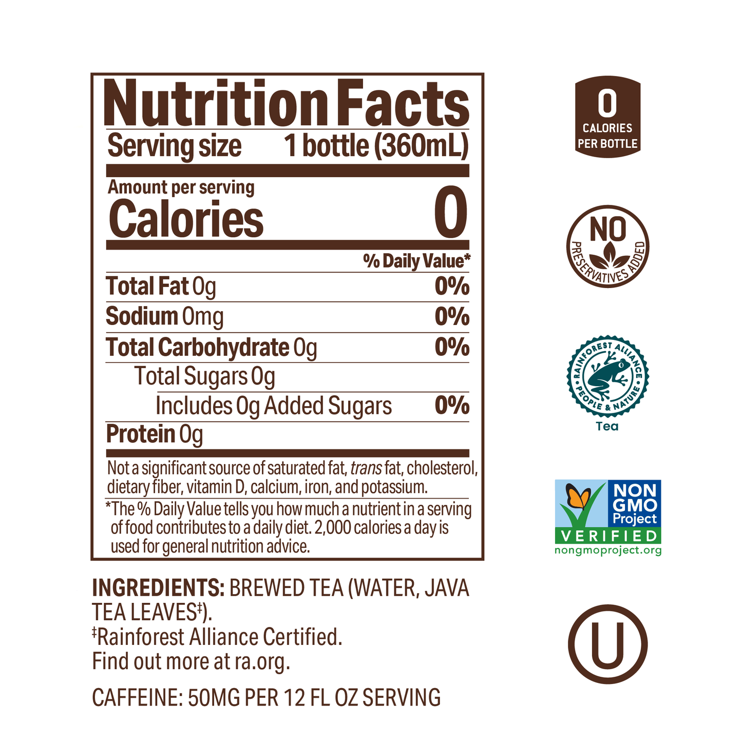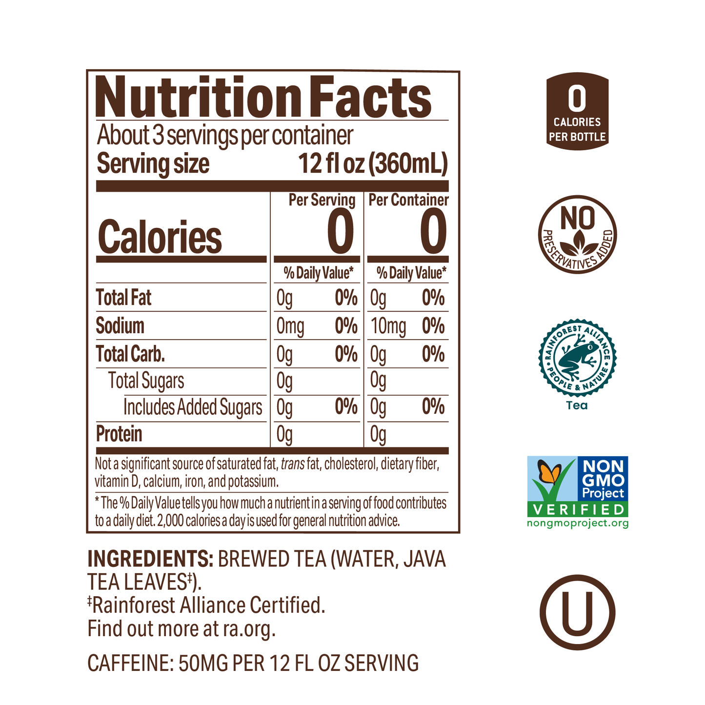 Our award-winning black tea is not just refreshing, bold, smooth with a true-to-the-tea taste—it's a nine-time recipient of top honors at the Global Tea Championship™. We start by sourcing high-quality tea leaves from Rainforest Alliance Farms in Java, Indonesia and small-batch brew our tea for a consistently tea-luscious ready-to-drink tea. We do not add sugar or sweeteners because our tea does not need them. And, due to our unique and stringent manufacturing processes, we also do not use any added preservatives.